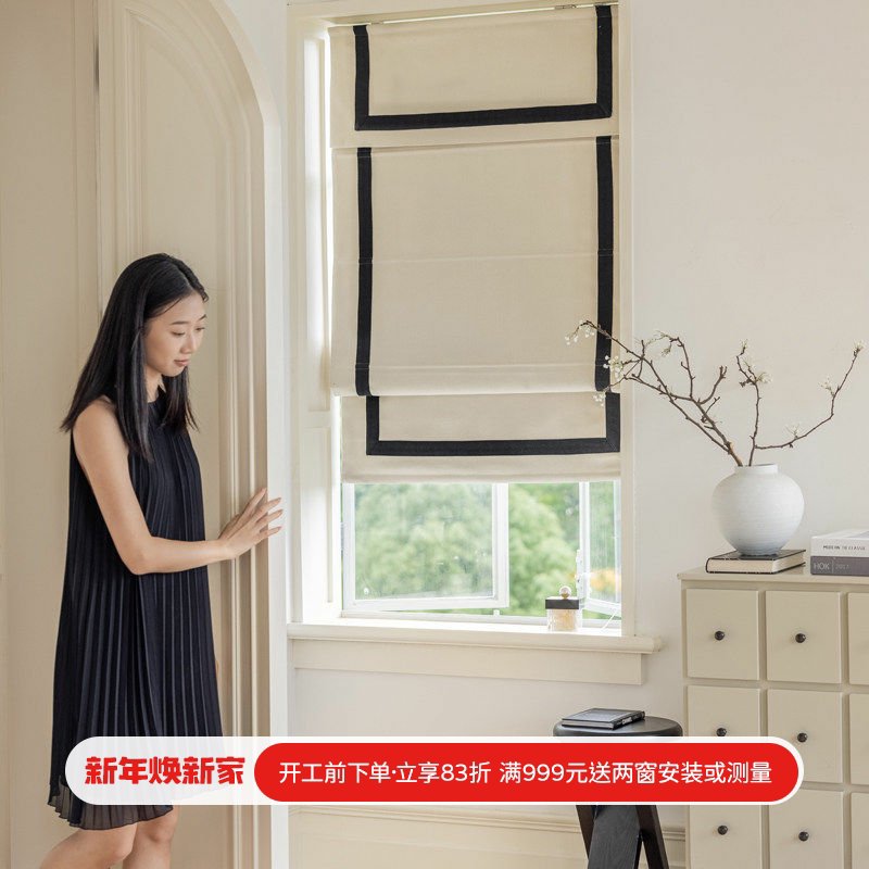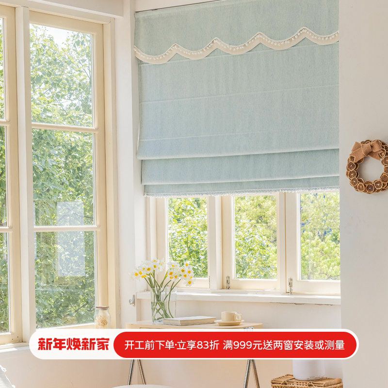 新款法式中古风镶边人字尼棉麻罗马帘阳台书房小窗户升降窗帘飘窗