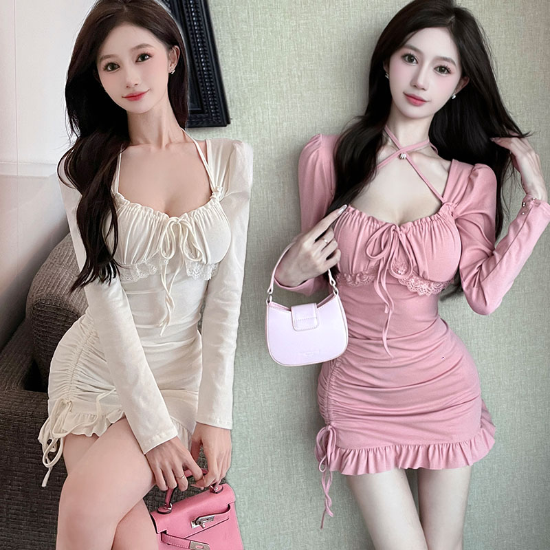 包臀连衣裙低胸露背夜店女装荷叶边弹力棉显身材性感技师工作服秋