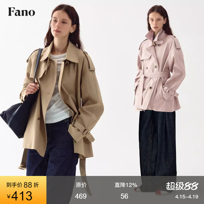 范洛Fano 复古经典廓形双排扣翻领风衣女2026系带气质中长款外套