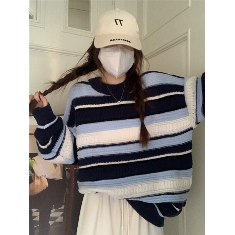 秋冬韩版学生条纹麻花毛衣女学院风慵懒宽松中长款撞色针织衫外套