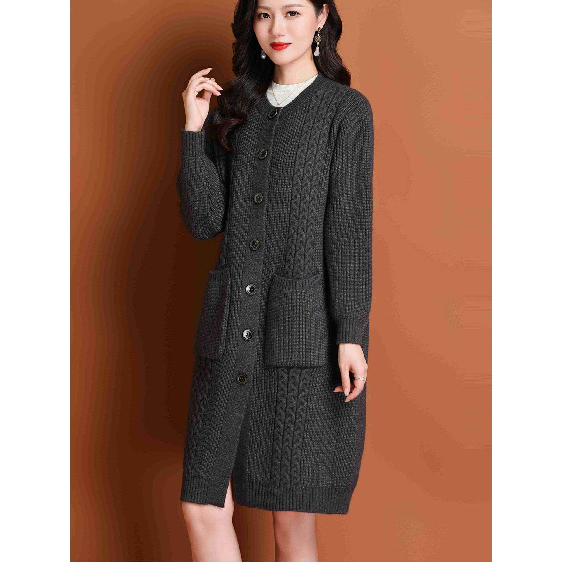 2025新款麻花针织开衫女中长款圆领纽扣毛衣外套高级感显瘦百搭