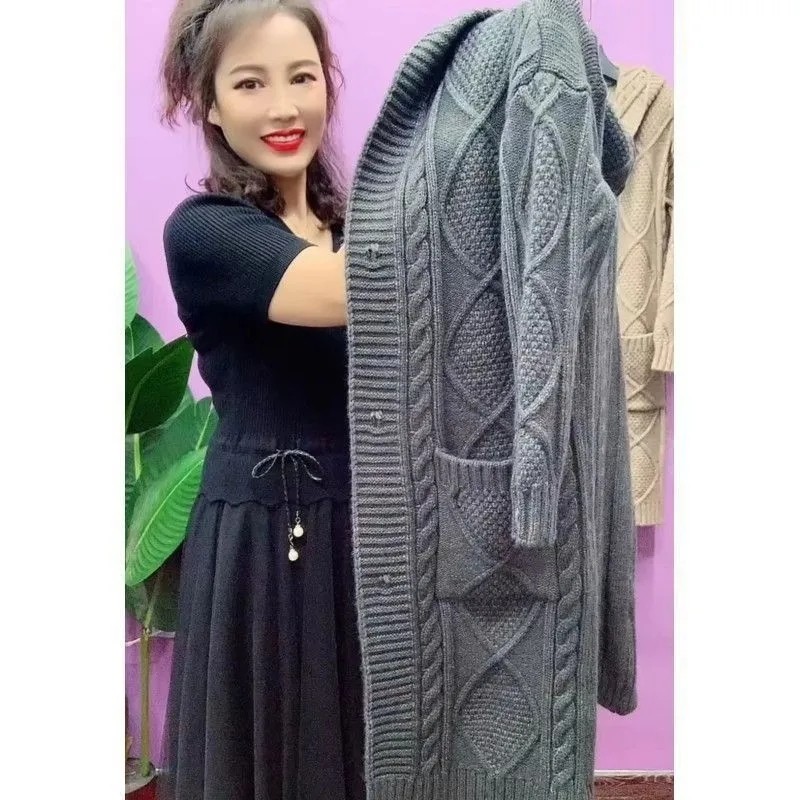 连帽粗线麻花毛衣外套开衫女中长款加厚带帽大衣宽松慵懒秋冬大衣