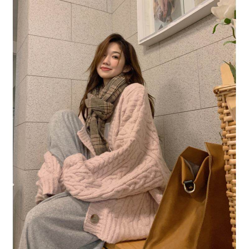 韩国慵懒麻花针织开衫女柔软亲肤秋季韩版V领纽扣中长款毛衣外套