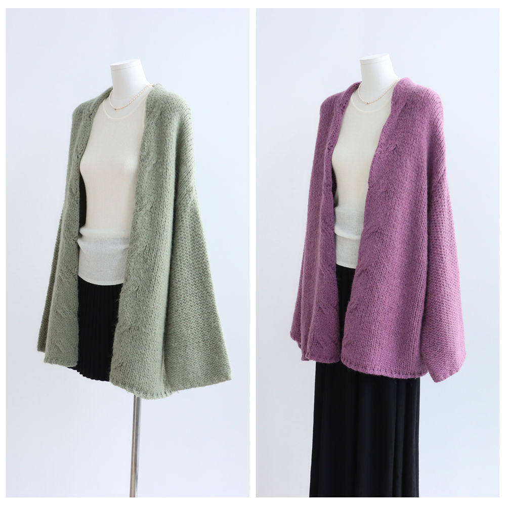 宝珠 韩系温柔紫色复古麻花针织毛衣开衫外套女中长款宽松慵懒感