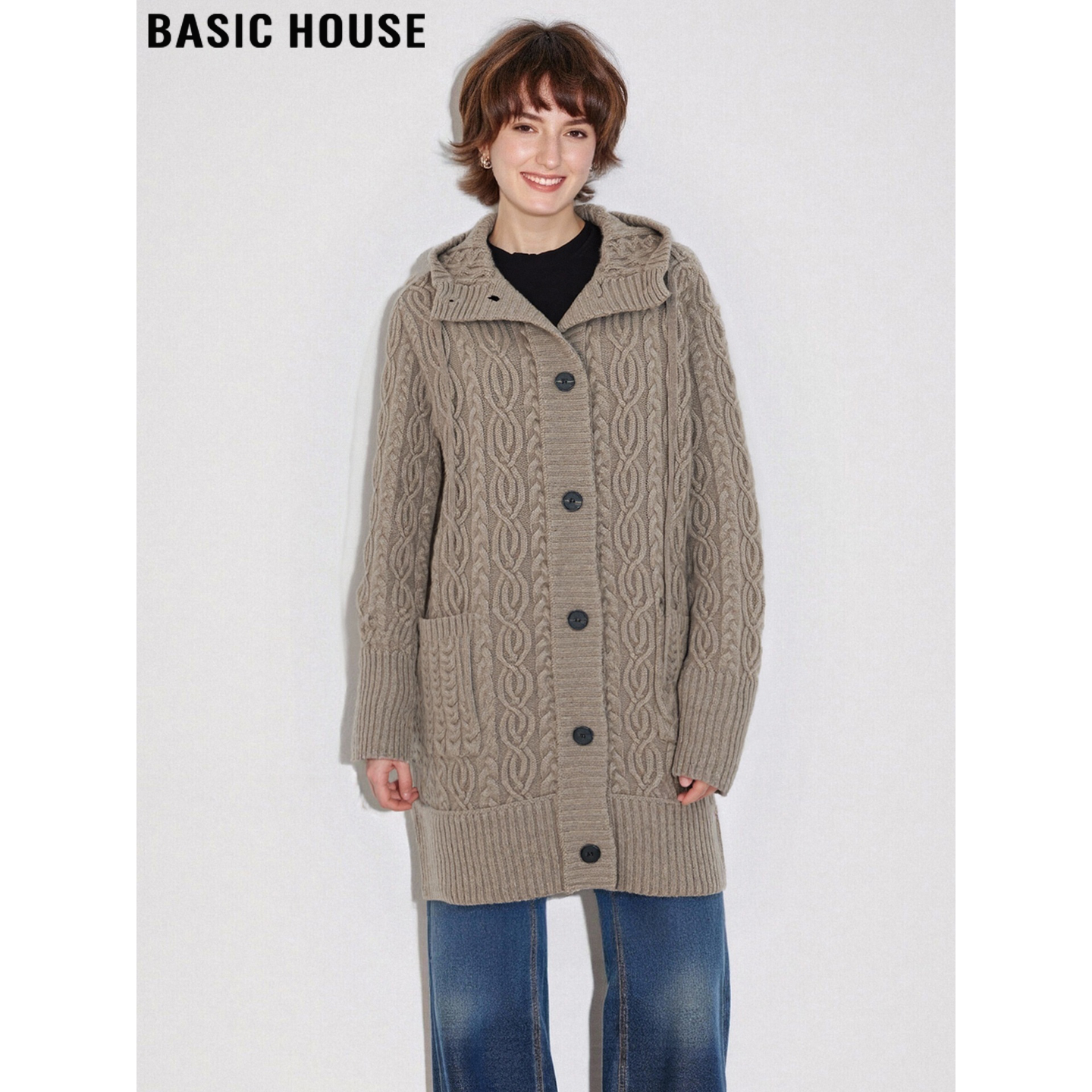 Basic House/百家好中长款连帽羊绒衫女冬季加厚羊毛麻花毛衣外套