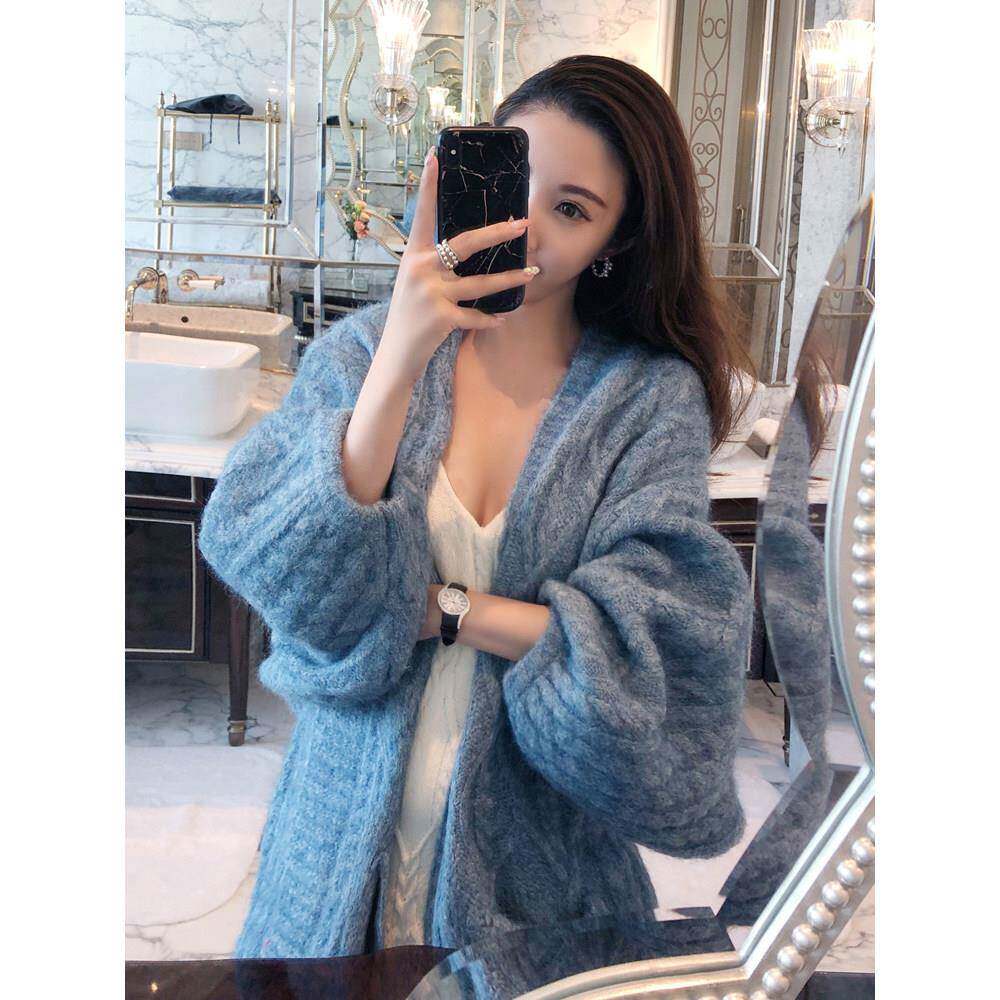 秋冬甜美糖果色V领复古麻花灯笼袖加厚毛衣慵懒风套头中长款外套