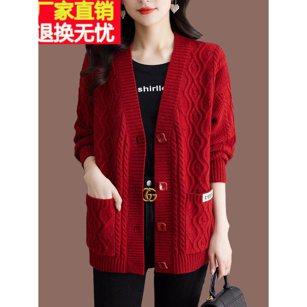 重工复古麻花氛围感宽松本命年酒红毛衣外套女秋冬加厚中长款开衫