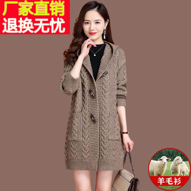 中长款连帽针织毛衣外套女秋冬装新款韩版宽松加厚牛角扣麻花开衫