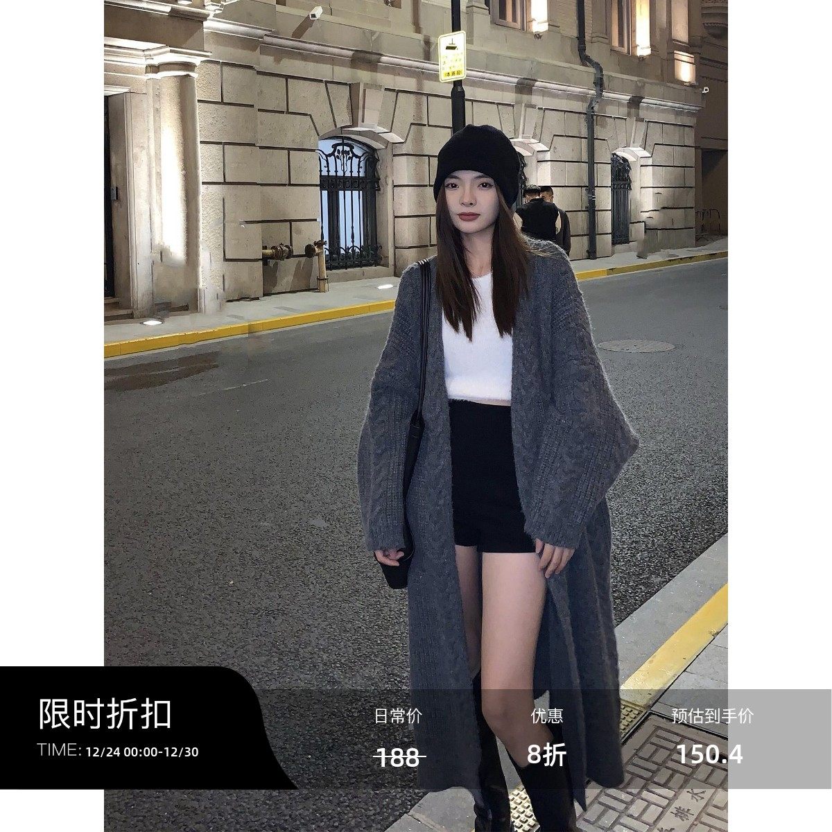 辰米范 灰色麻花中长款毛衣女开衫秋冬新款宽松加厚针织外套大衣