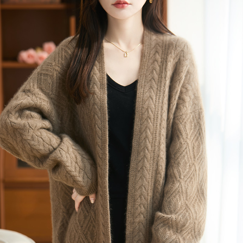 V领宽松慵懒风100%纯羊毛开衫女中长款麻花加厚毛衣羊绒外套上衣