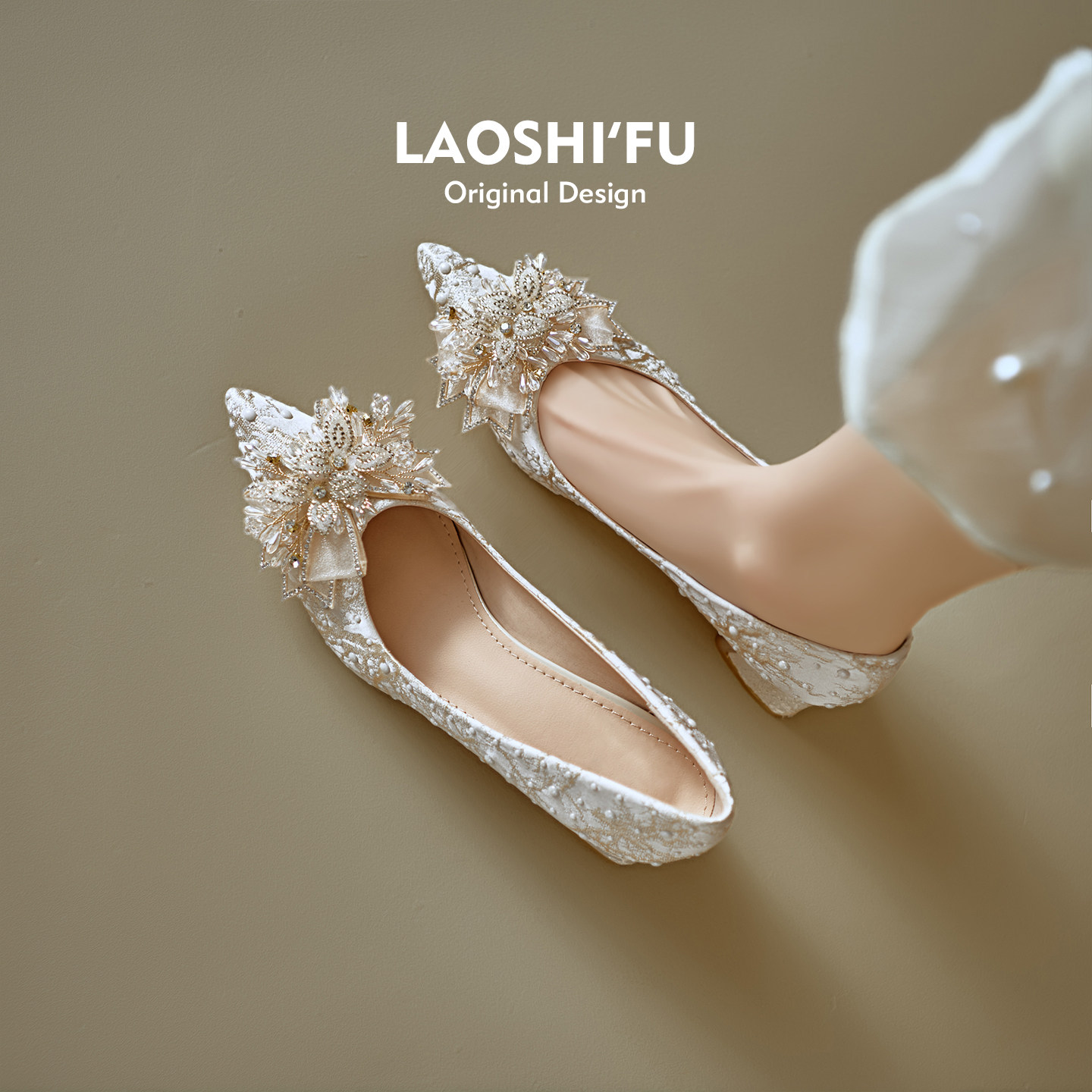 羊皮版~尖头水钻蝴蝶结粗跟单鞋女2026新款不累脚高跟伴娘鞋婚鞋