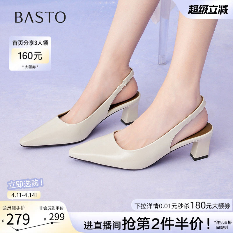 百思图夏季商场新款气质粗跟高跟鞋尖头后空女凉鞋B2610BH5