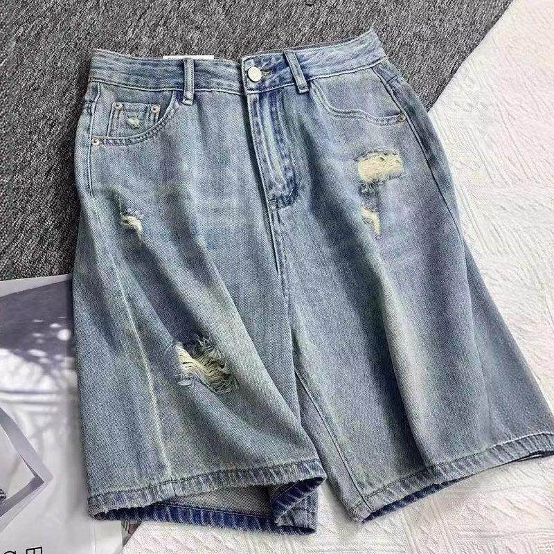 破洞直筒牛仔五分裤女夏季新款韩版高腰宽松小众A字短裤阔腿中裤