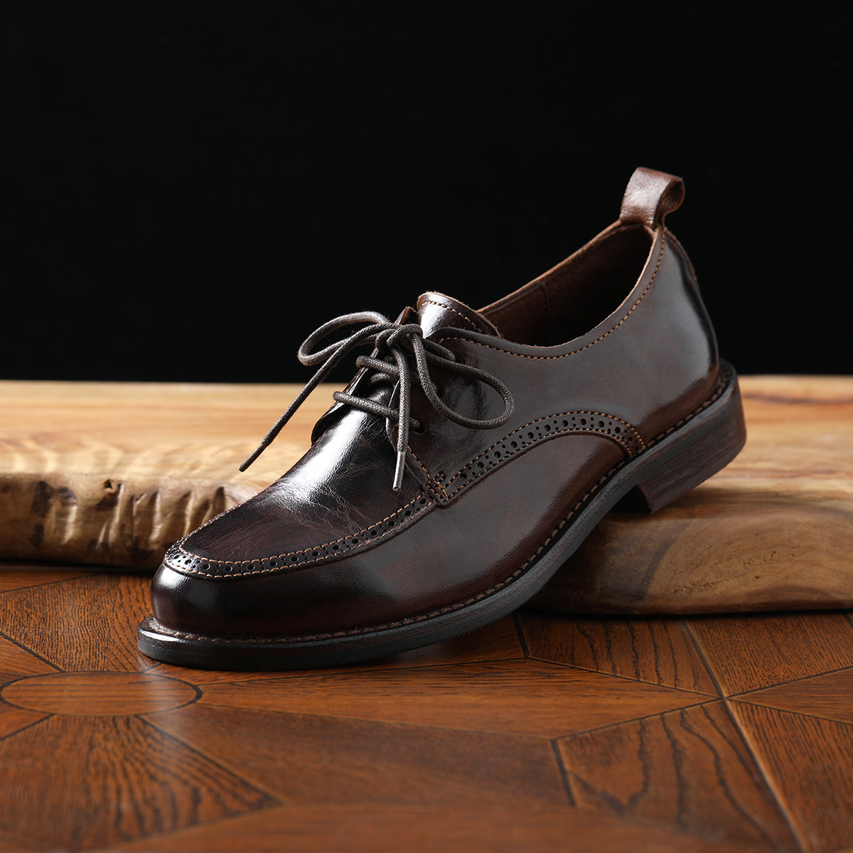ED08049 茉莉雅集 复古水洗马皮系带深口单鞋布洛克小皮鞋乐福鞋