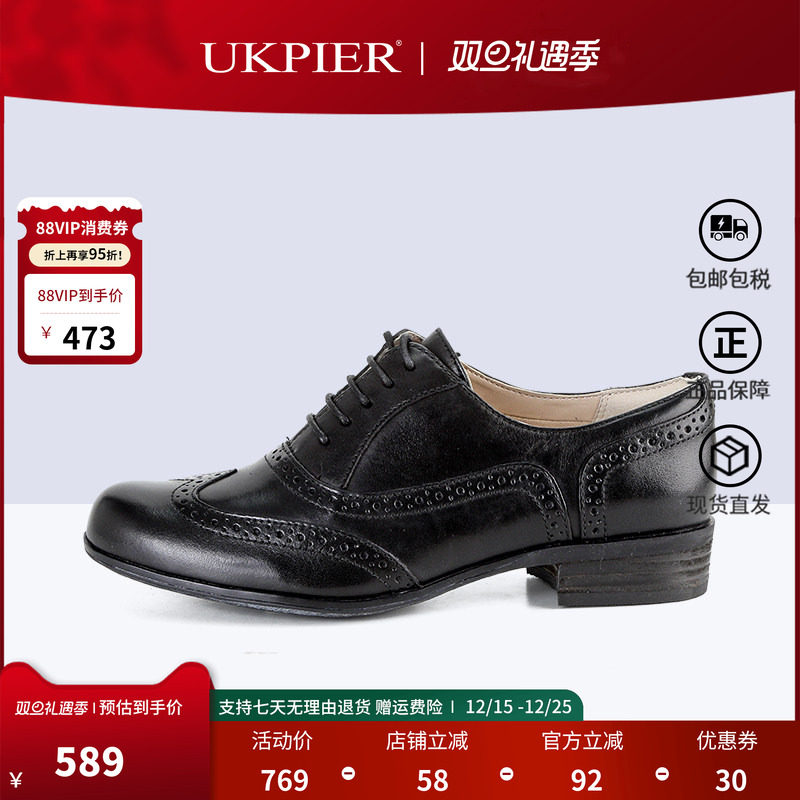 康莉牛皮小皮鞋女2024秋新款真皮深口单鞋免系带布洛克女鞋牛津鞋