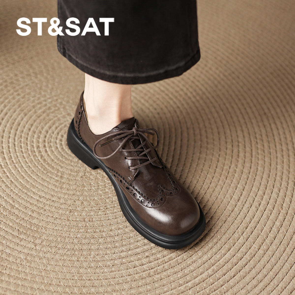 星期六复古系带乐福鞋女2025新款秋冬老钱风布洛克单鞋棕色小皮鞋