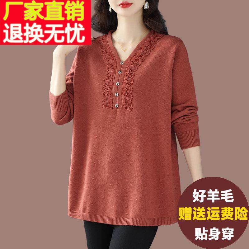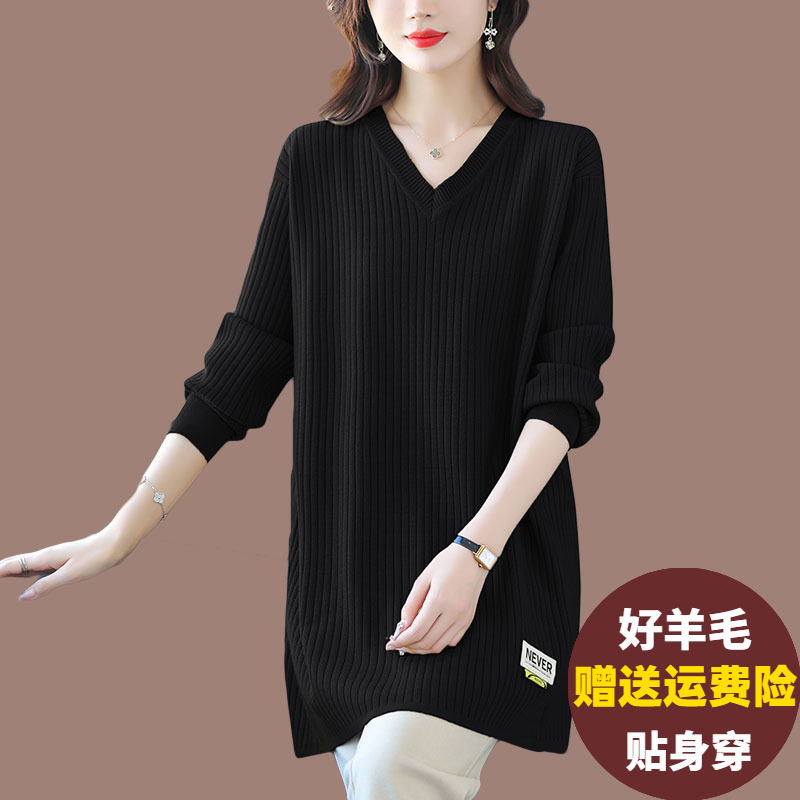 中长版羊毛衫女秋冬大尺码遮肚显瘦V领上衣洋派妈妈外穿针织打底