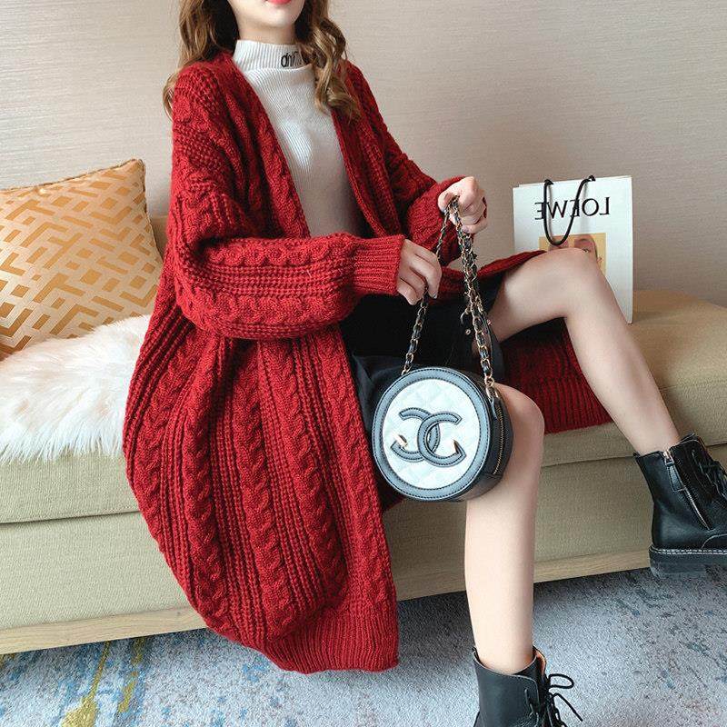 毛衣针织开 衫女2025年秋冬新款红色宽松慵懒风加厚中长版上衣外