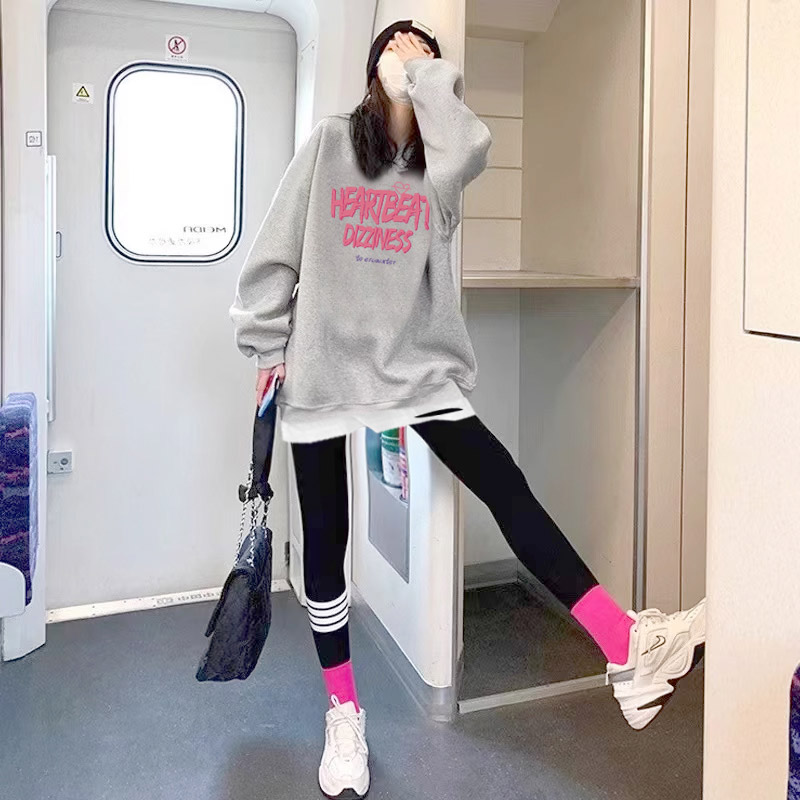 灰色甜酷字母假两件卫衣女2023秋冬新款中长版遮屁股上衣加绒外套