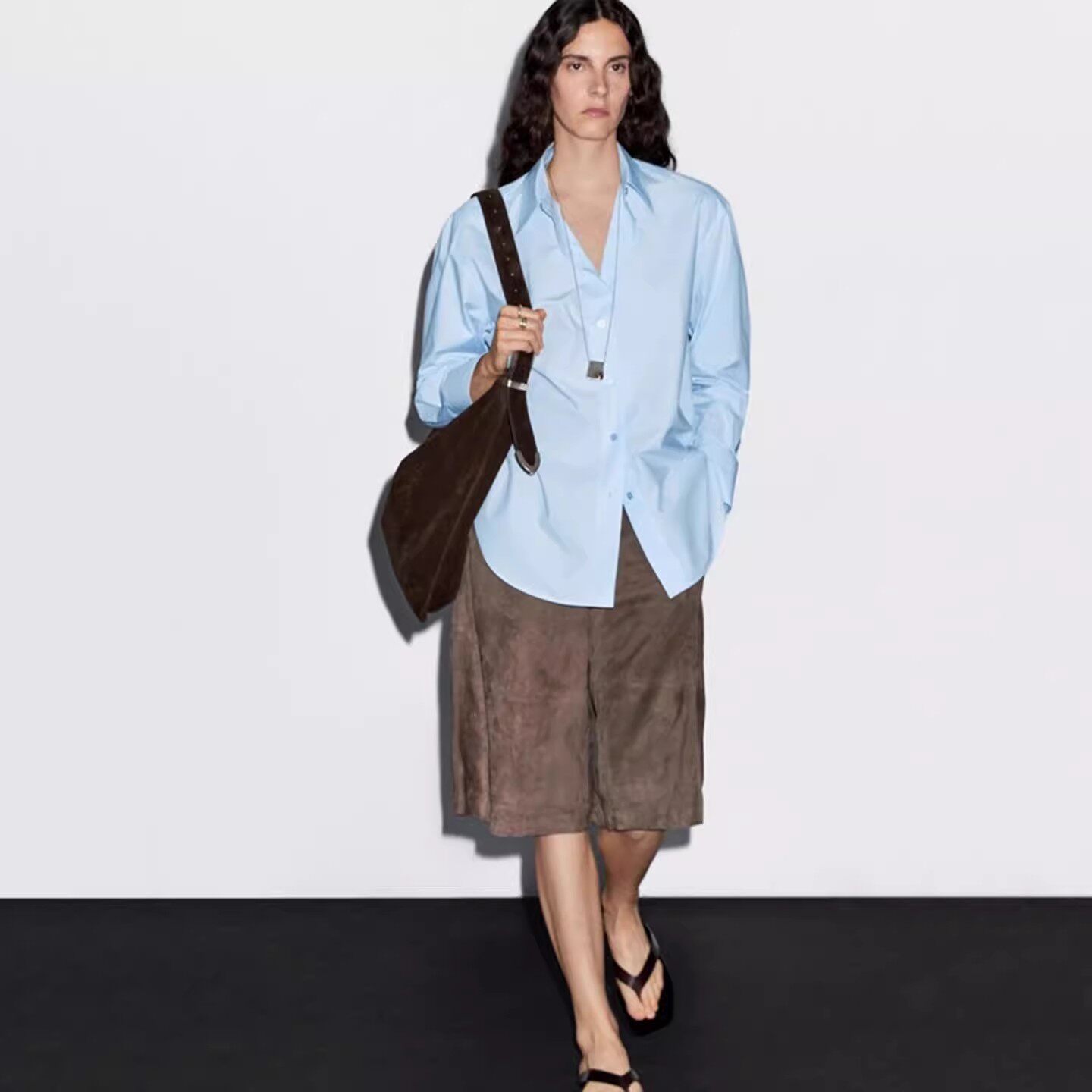 西班牙女装 2025秋季百搭极简风高智感宽松通勤全棉长版衬衫上衣