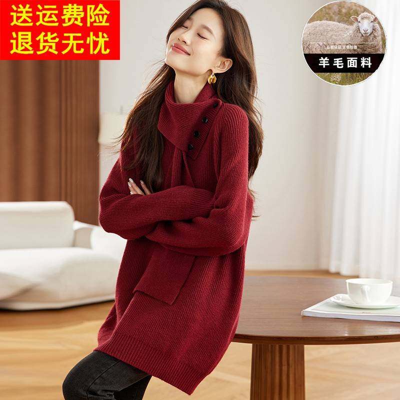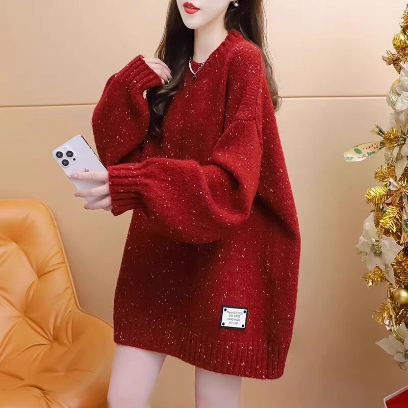 红色中长版毛衣女春秋2025新款高级感气质宽松圆领打底针织衫上衣