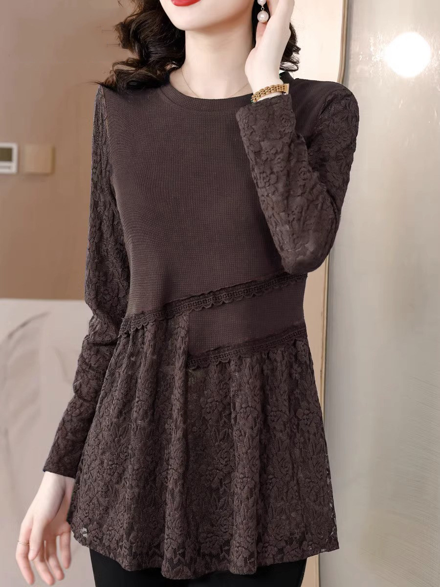 长袖针织衫女秋冬加绒2025年新款时尚洋派蕾丝打底衫女中长版上衣