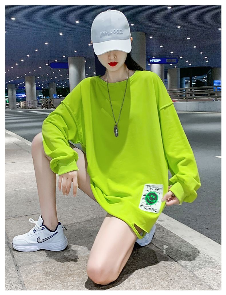 萤光绿圆领厚棉T女春秋款2025新款宽松中长版过臀长袖打底上衣潮