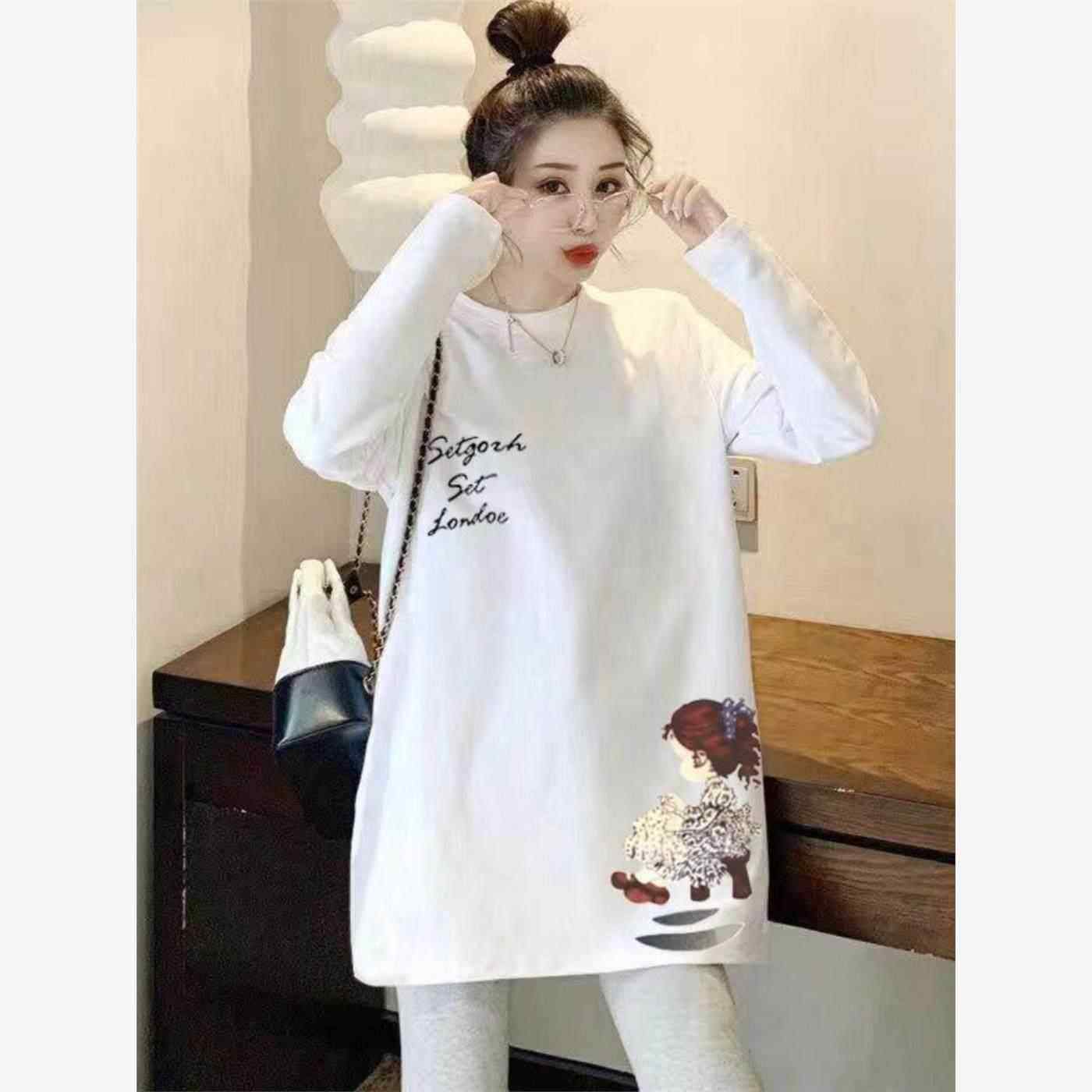 白色长袖T恤女夏季宽松大尺码中长版字母印花圆领正肩纯棉T恤上衣