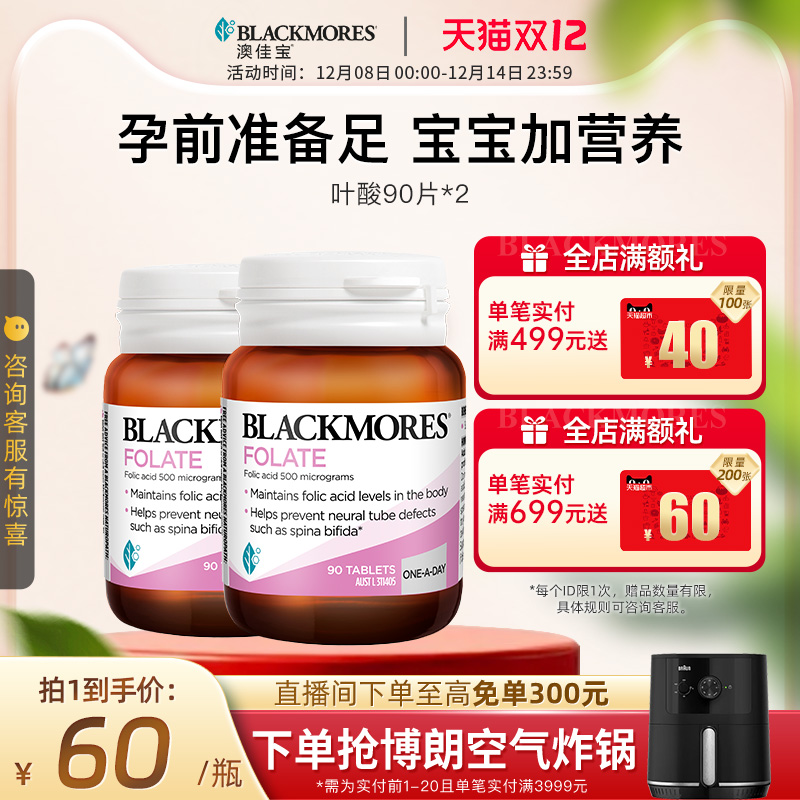 澳佳宝BLACKMORES叶酸孕妇早期90片*2备孕期专用营养澳洲官方正品
