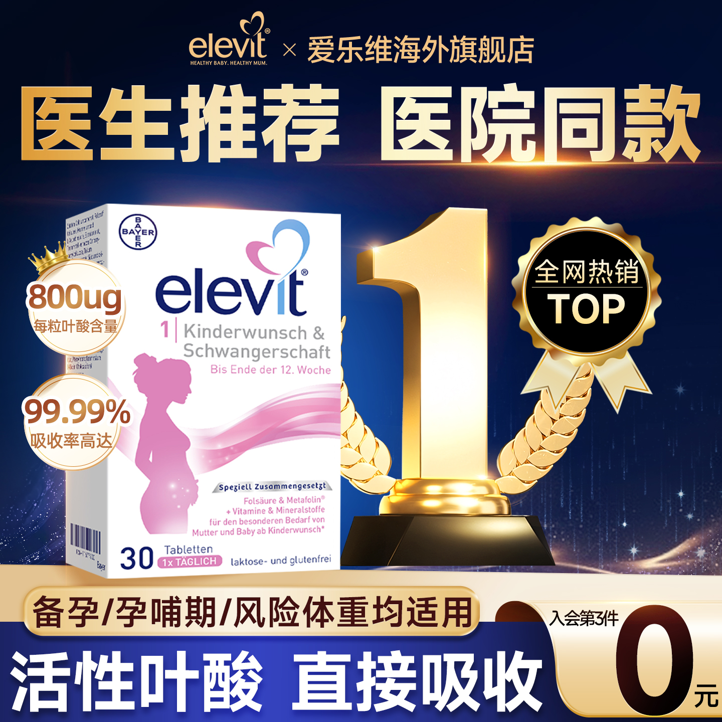 【旗舰店】Elevit爱乐维1段活性叶酸孕妇专用+男士备孕复合维生素