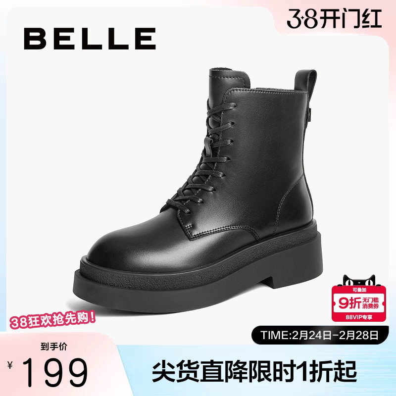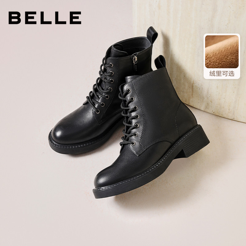 百丽女靴子英伦风马丁靴女款冬季新款厚底加绒短靴子B9T1DDD4