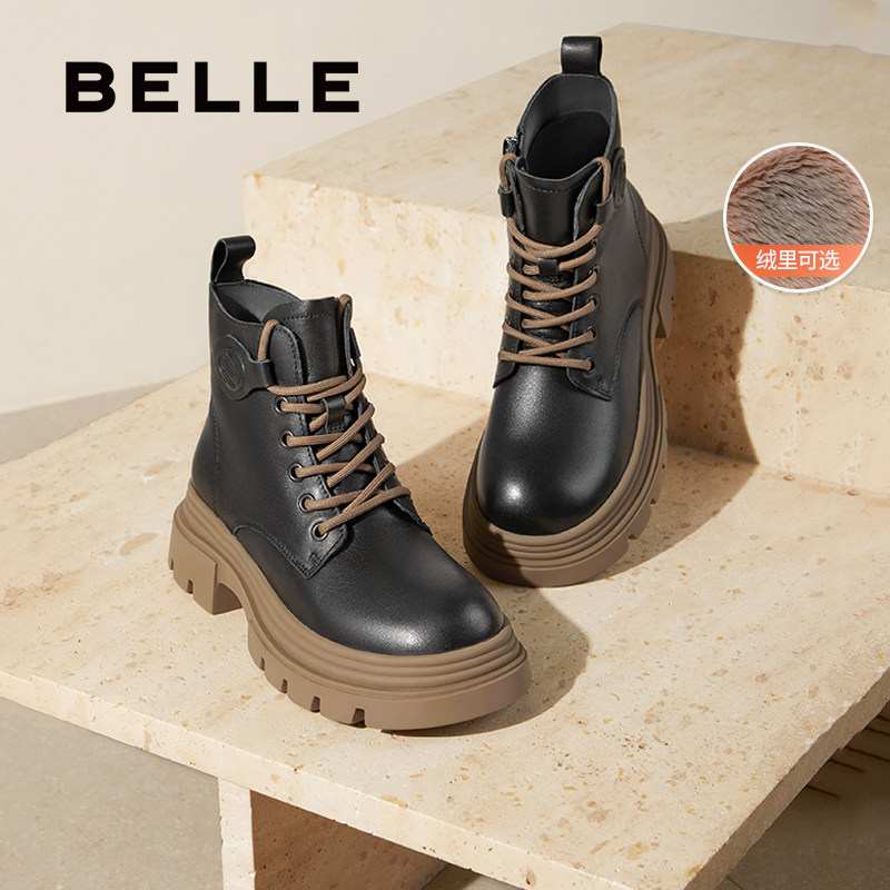 百丽厚底真皮英伦风马丁靴女冬季新款加绒保暖显瘦短靴子E4W1DDD5
