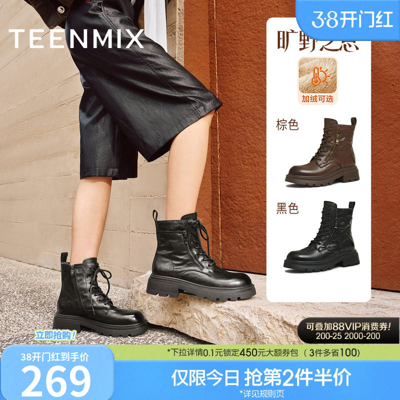 天美意复古厚底英伦马丁靴女鞋子休闲短靴皮靴时装靴2025冬季新款