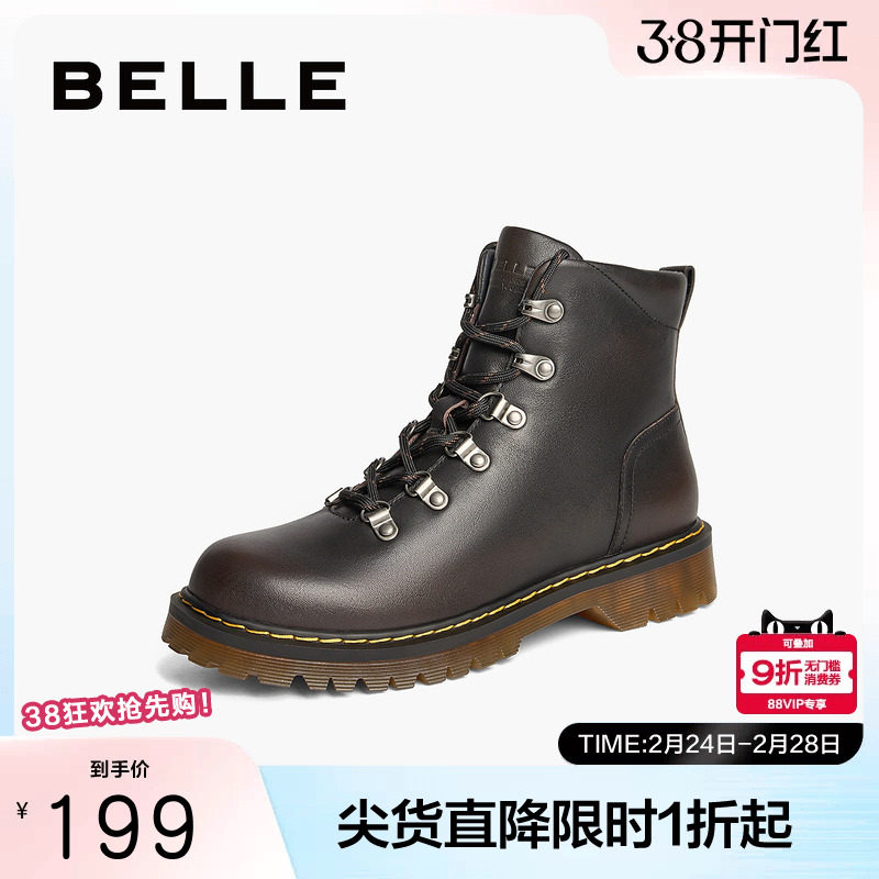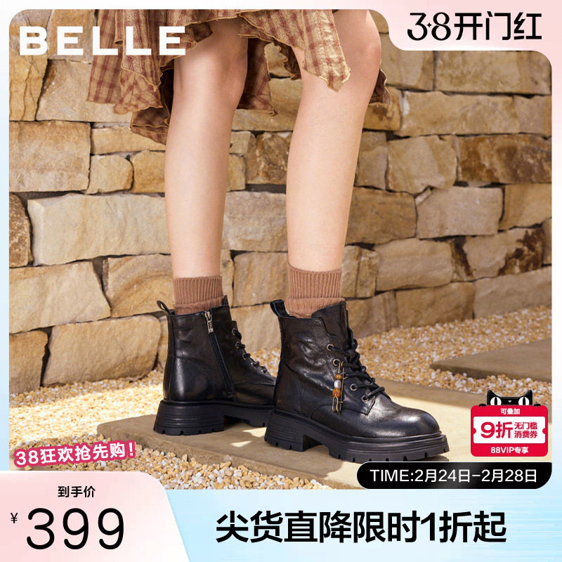 百丽女靴子英伦风马丁靴冬季新款真皮显瘦加绒厚底短靴E8M2DDZ5