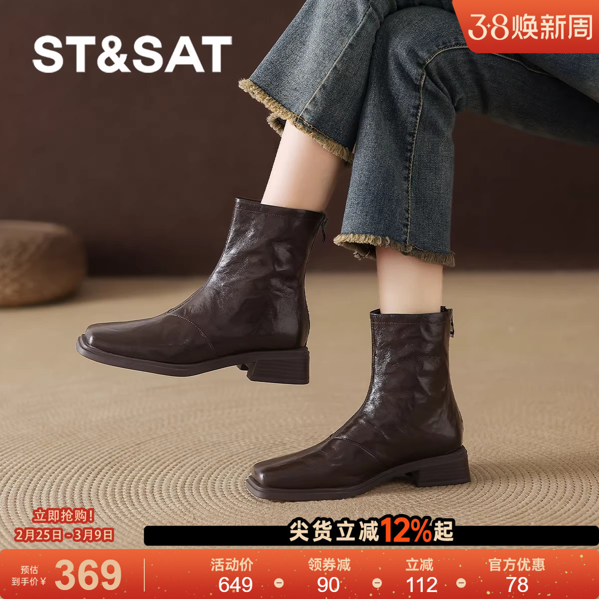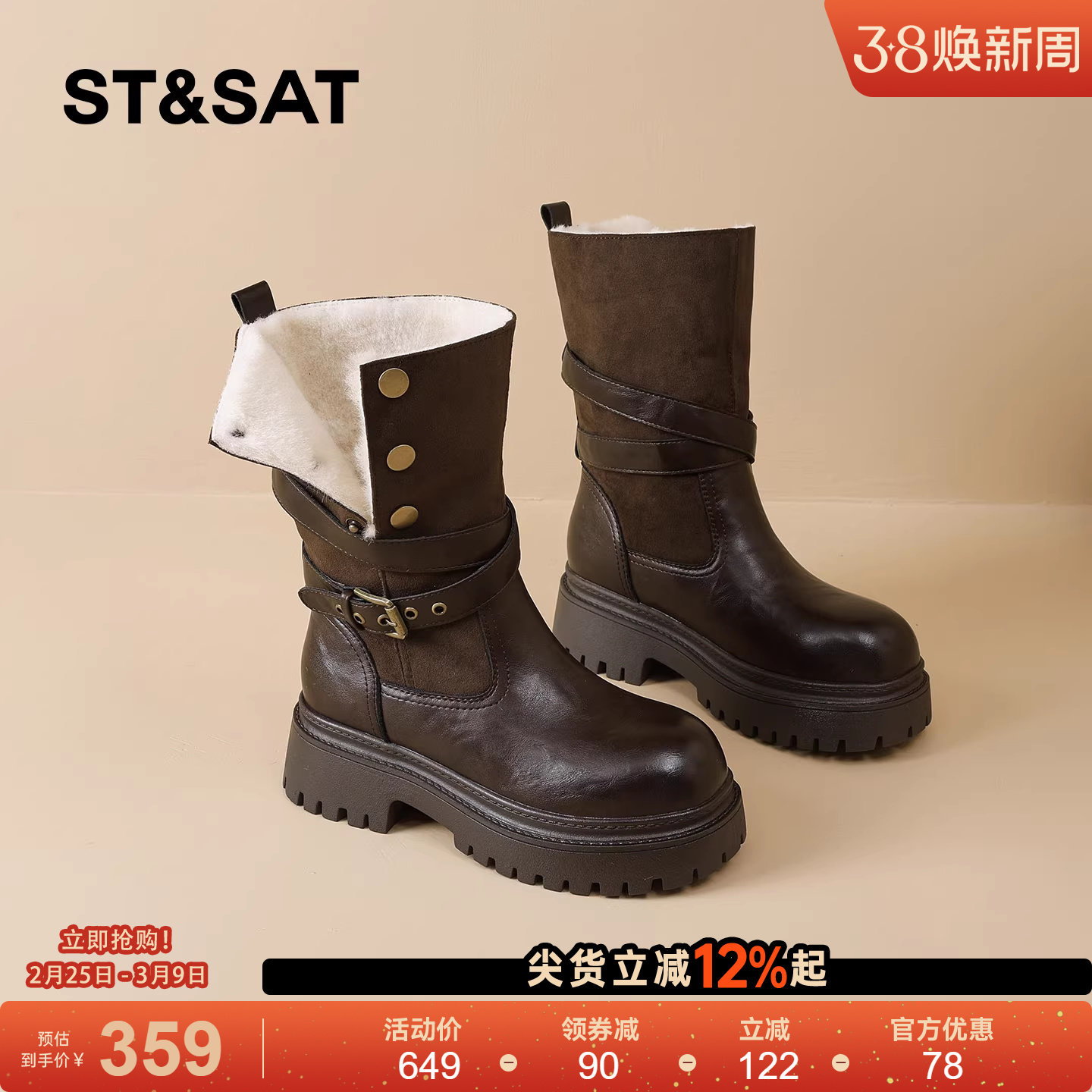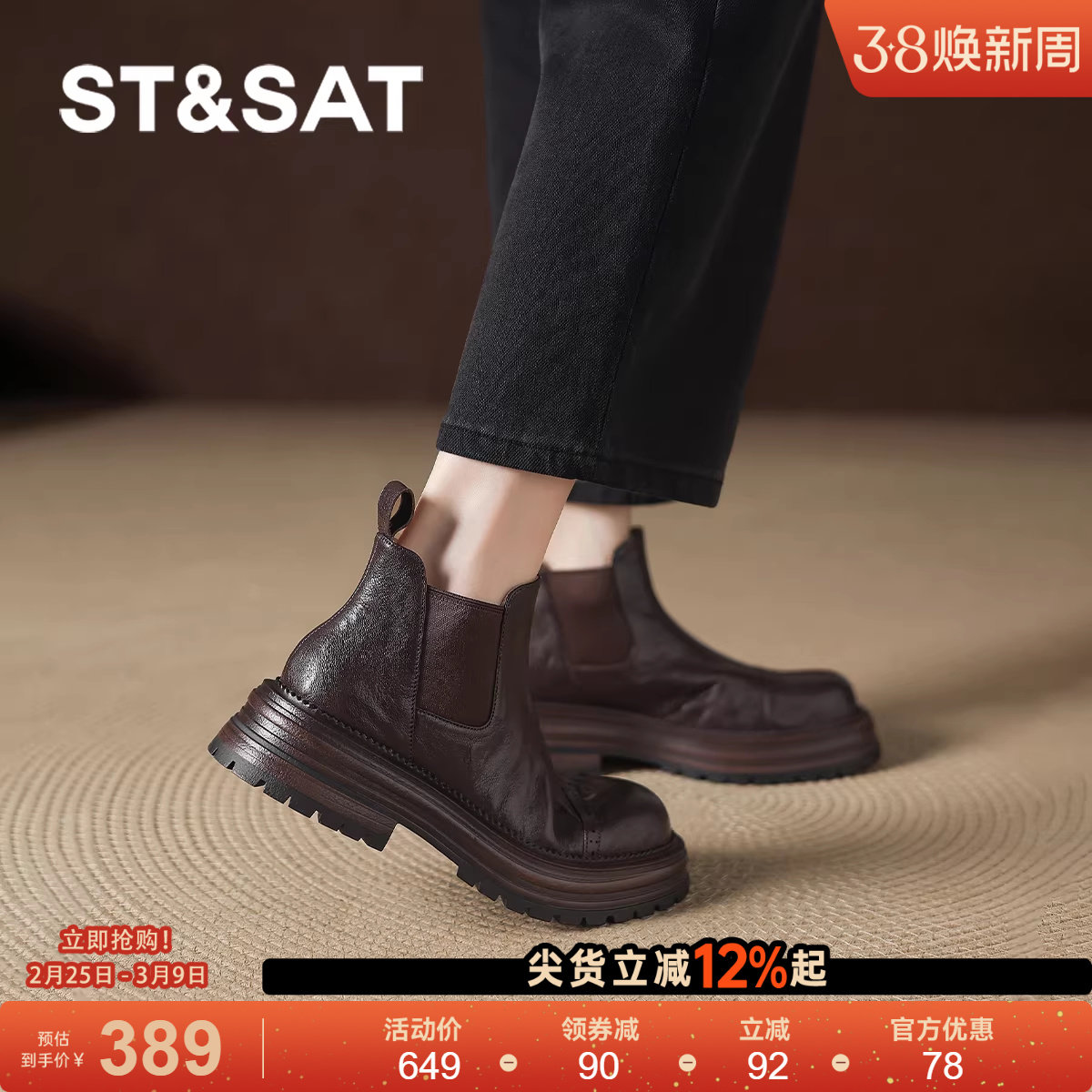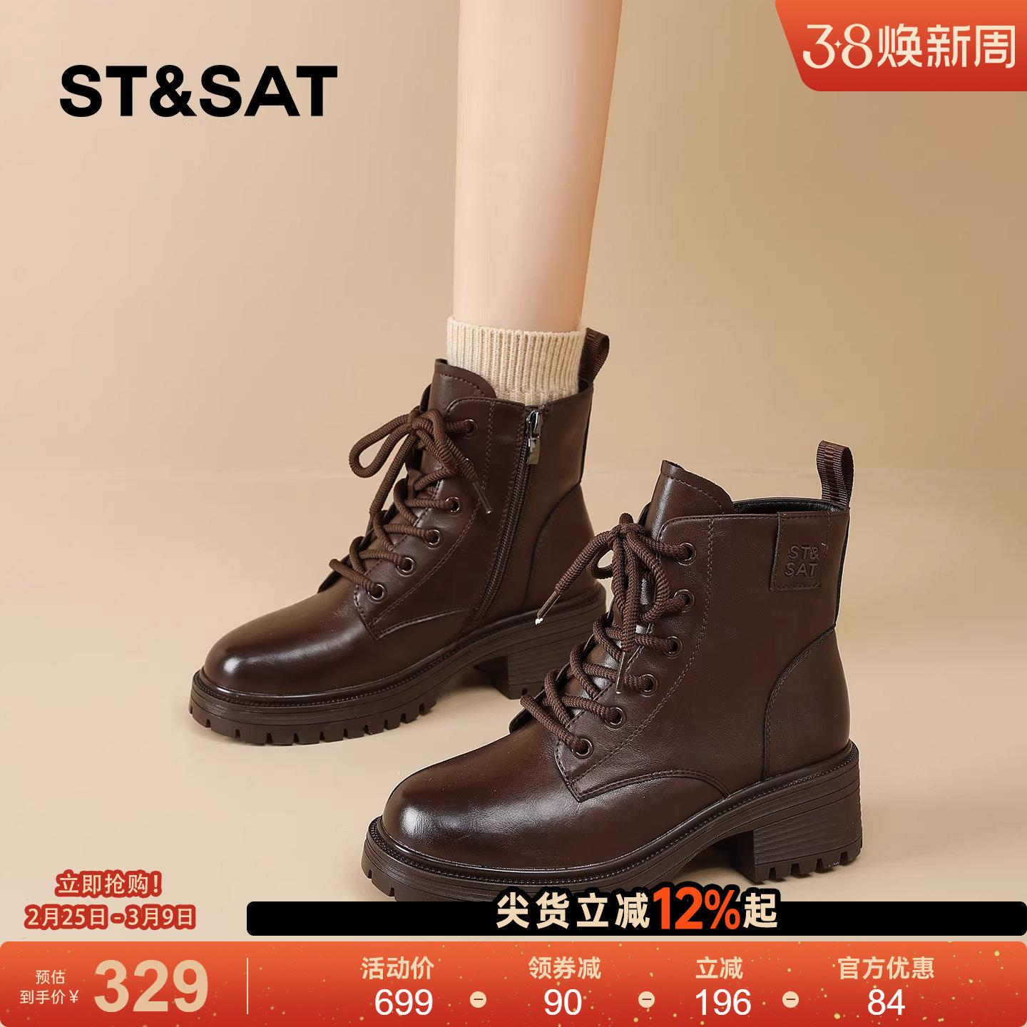 星期六真皮靴英伦风小短靴女款棕色马丁靴女靴子秋冬季加绒巨好看