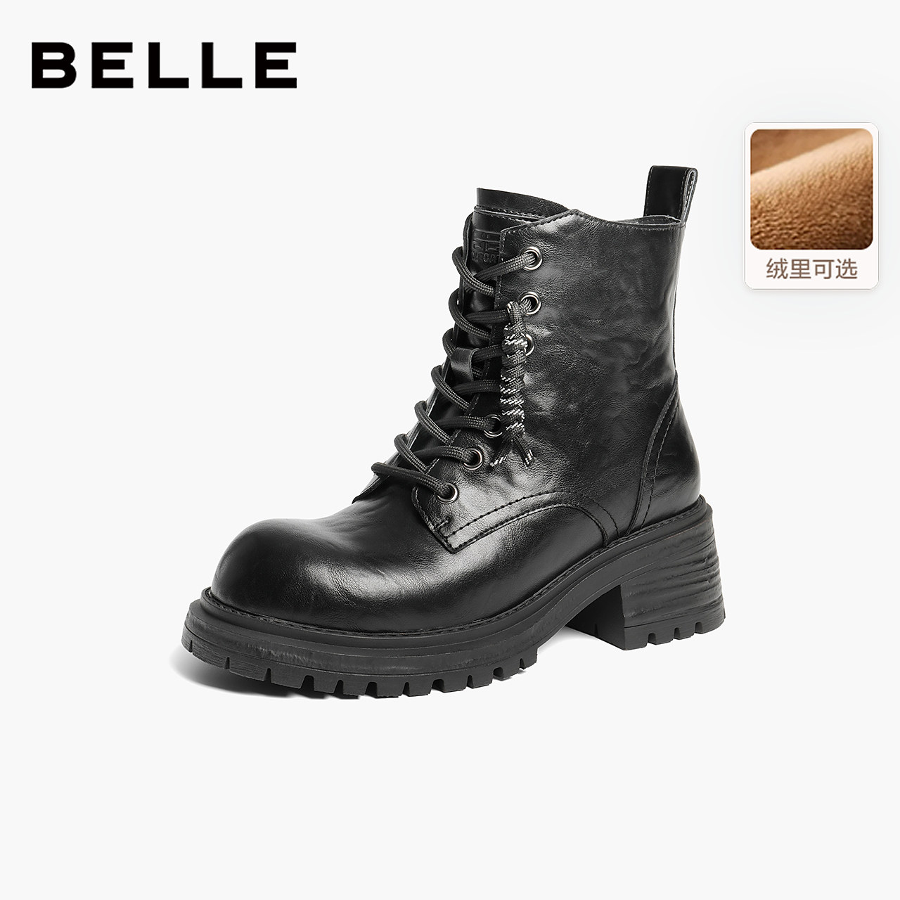 百丽加绒靴子羊皮英伦风马丁靴女冬季显瘦瘦粗跟休闲短靴E5S2DD