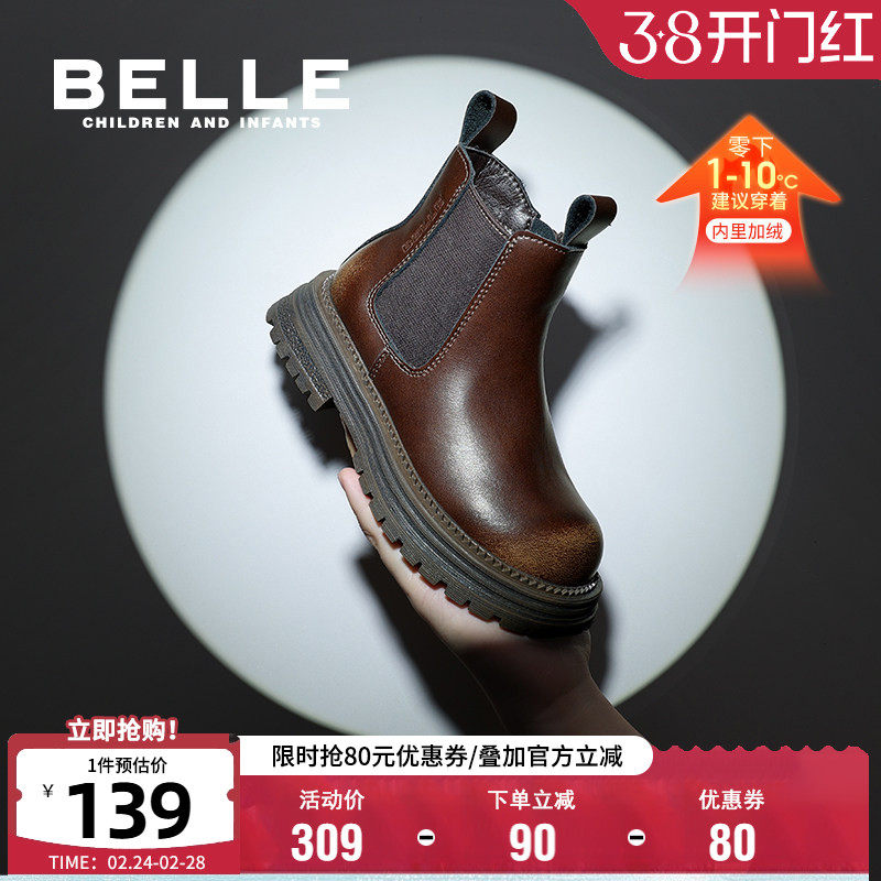 百丽童鞋女童时尚皮靴冬季儿童英伦风马丁靴软底加绒保暖时装短靴