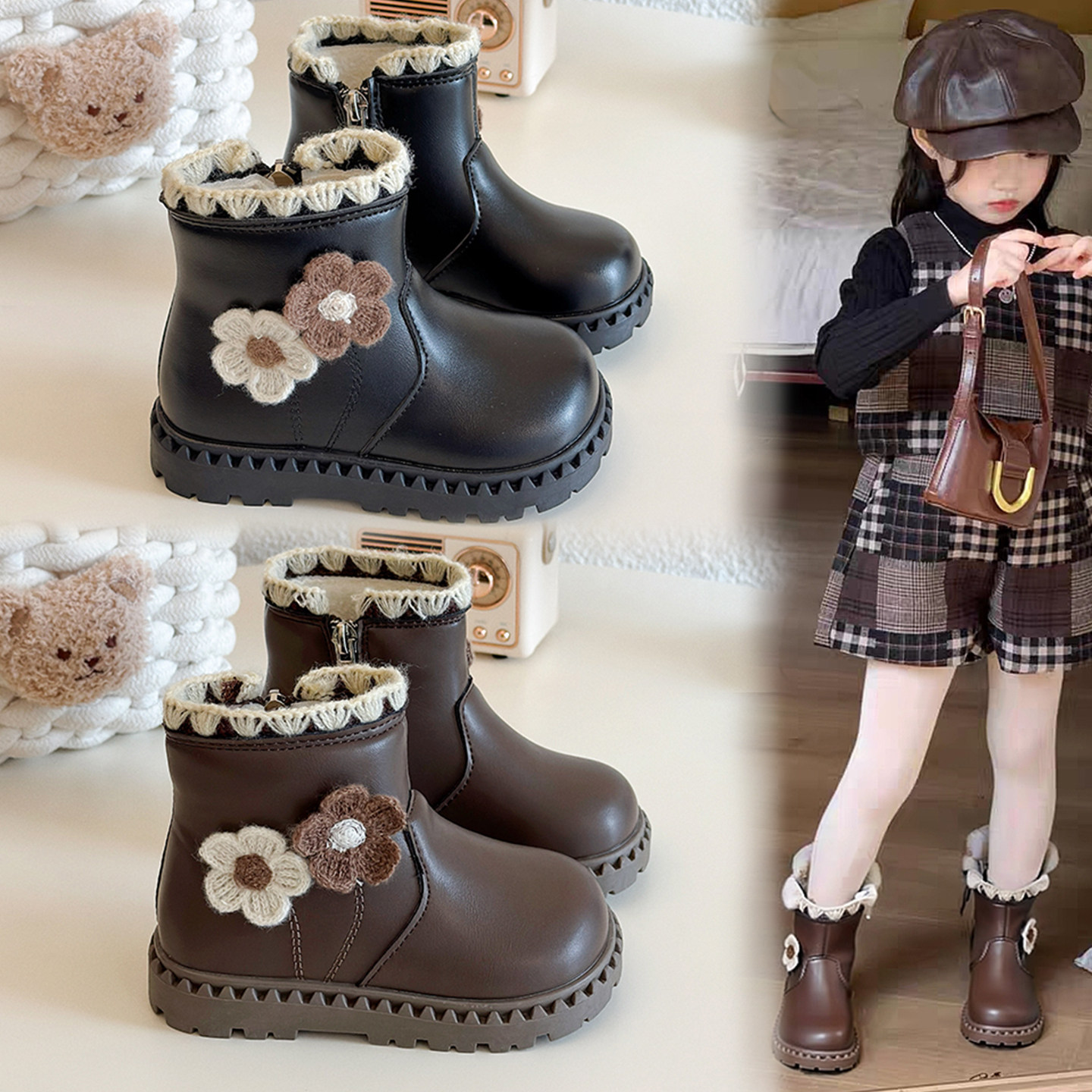 女童短靴2025新款冬季儿童软底防滑加绒保暖棉鞋女宝英伦风马丁靴