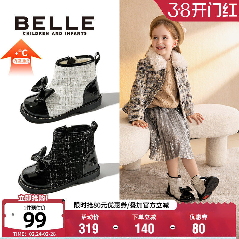 百丽童鞋女童烟筒靴加绒保暖英伦风时装靴冬季儿童时尚百搭马丁靴