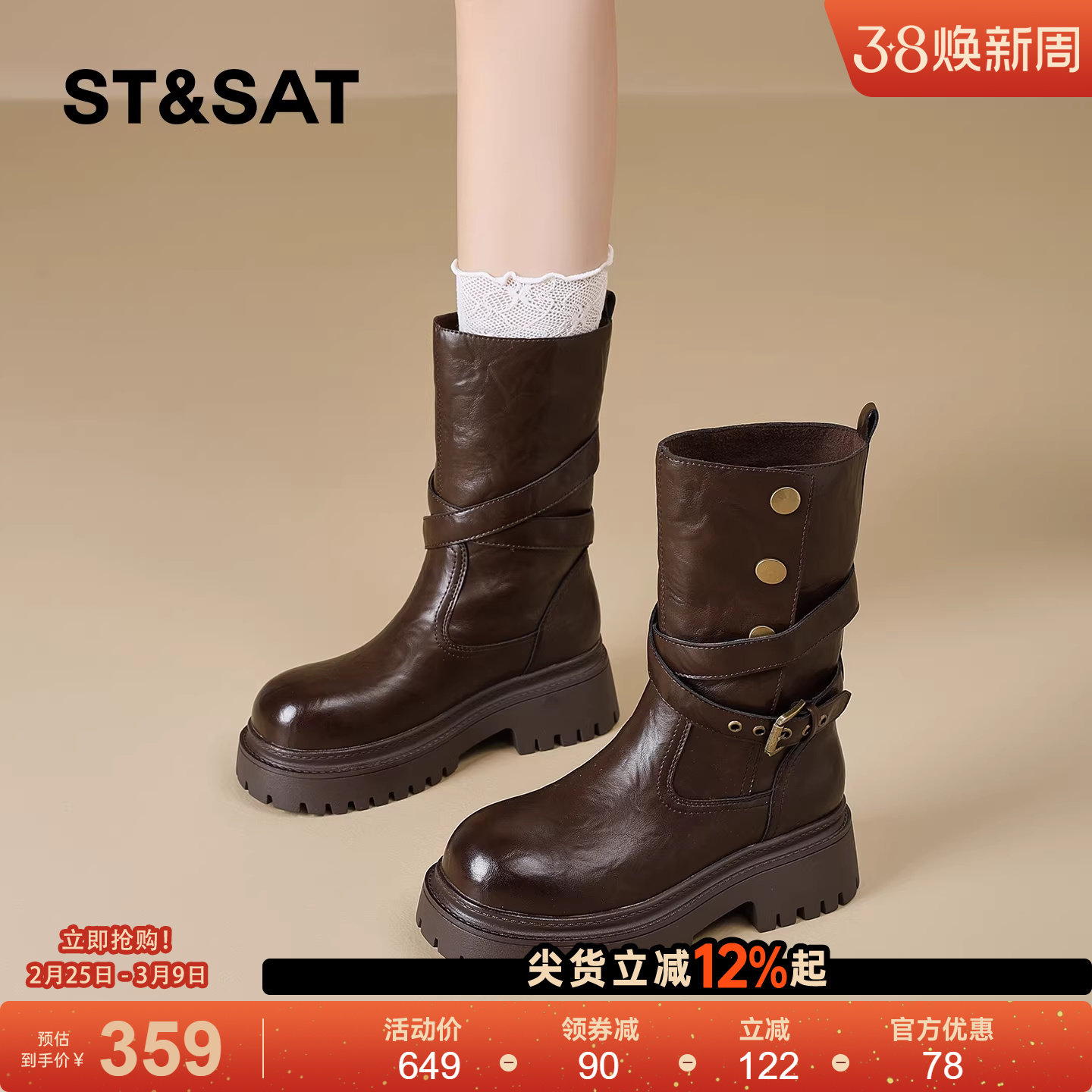 星期六厚底马丁靴女2025款冬季英伦风复古美拉德中筒靴潮酷机车靴