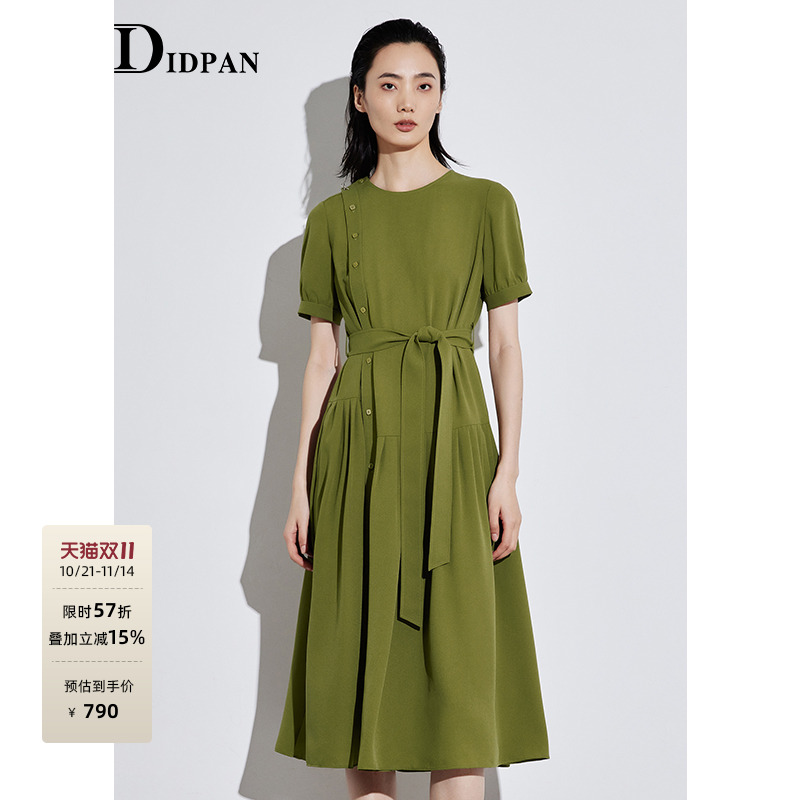 IDPAN女装时尚通勤设计感立体褶裙摆复古泡泡短袖圆领系带连衣裙