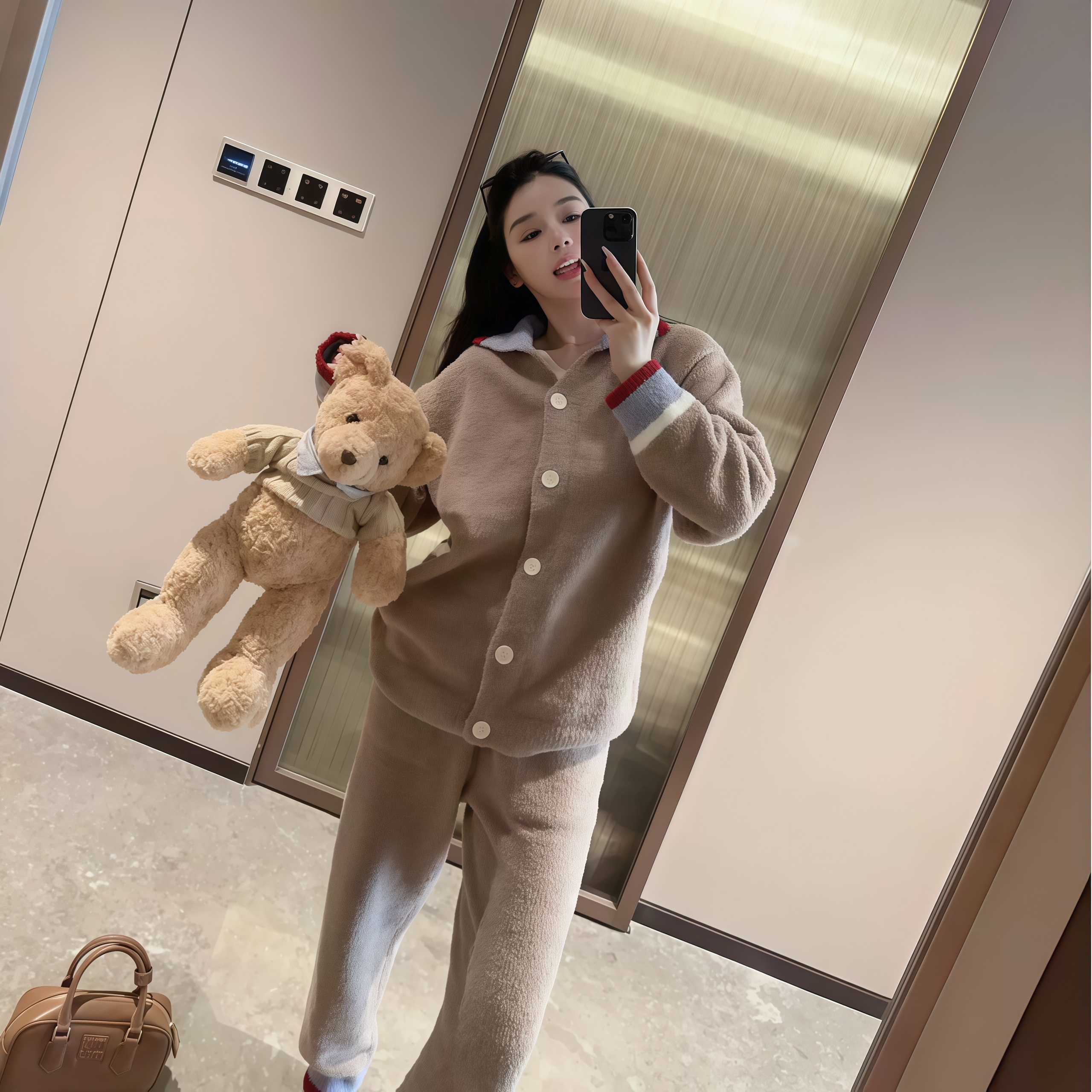 韩版撞色珊瑚绒睡衣女秋冬季新款高级感半边绒加绒加厚长袖居家服
