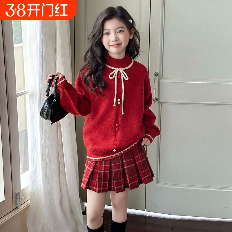 新中式女童套装裙子秋冬2026马年大童拜年服红色毛衣连衣裙两件套