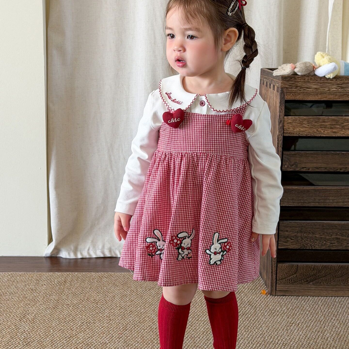 Amybaby女童套装冬季2025新款洋气刺绣连帽卫衣红色格子百褶裙
