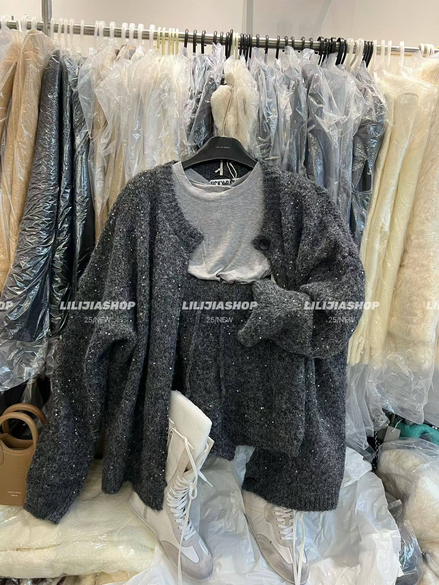 Miss家 2025秋冬韩版时尚百搭宽松显瘦亮晶毛衣开衫+抽绳短裤套装