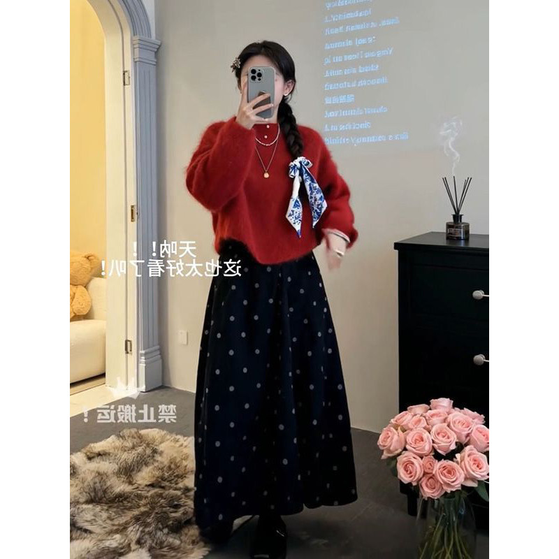 韩版复古通勤软糯气质长袖短款红色毛衣+秋冬款波点a字裙两件套装