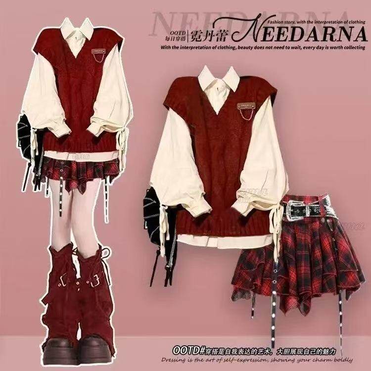 两件套/秋冬套装2024新款韩版红马甲叠穿百搭设计感手绑衬衫套装