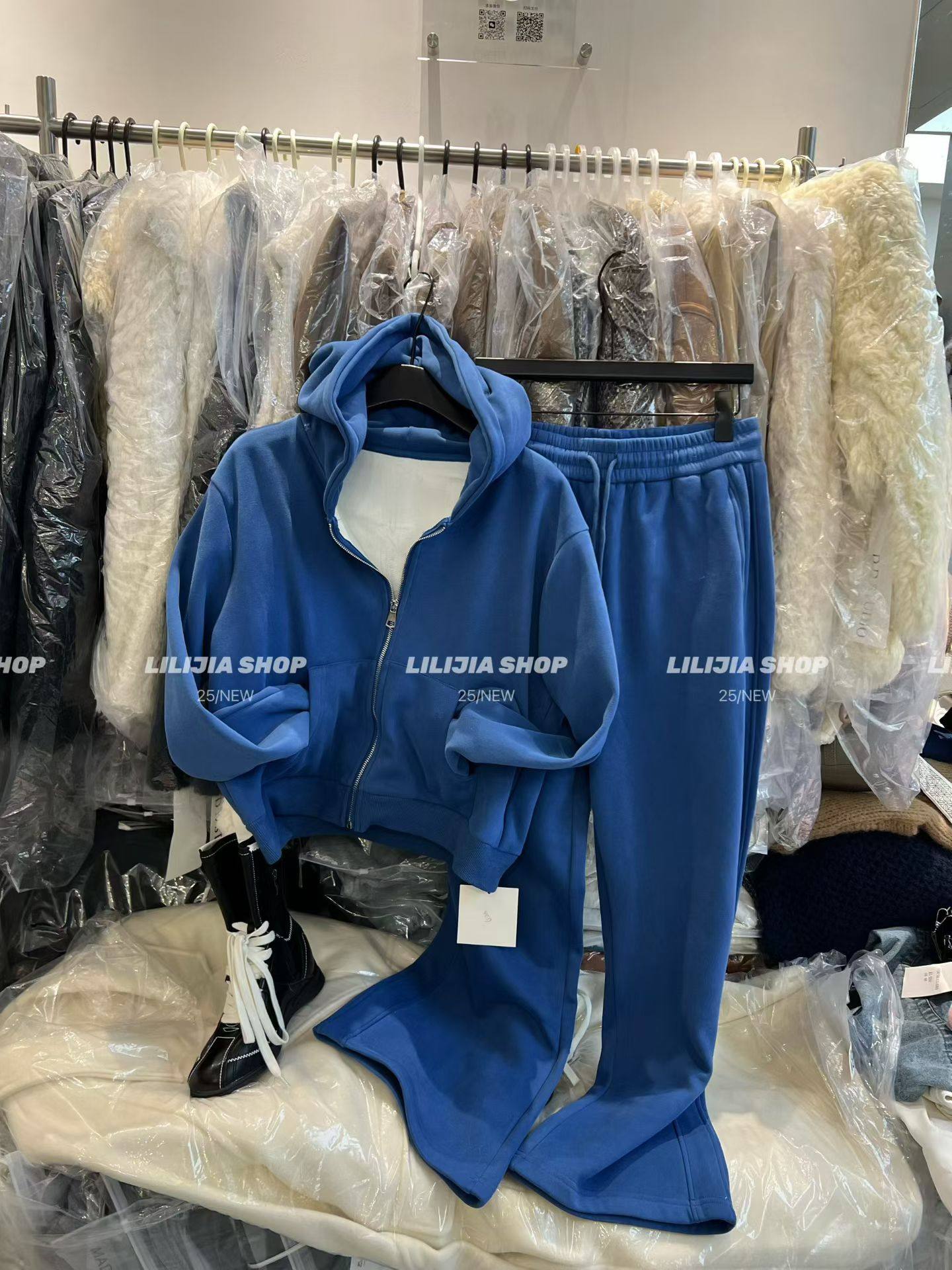 Miss家 2025秋冬韩版时尚百搭宽松翻领毛毛卫衣外套+阔腿裤套装