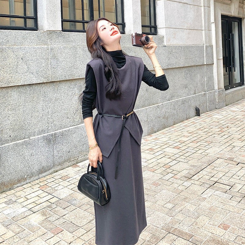 2025年秋冬新款韩版设计感收腰显瘦背带连衣裙打底衫两件套装女潮