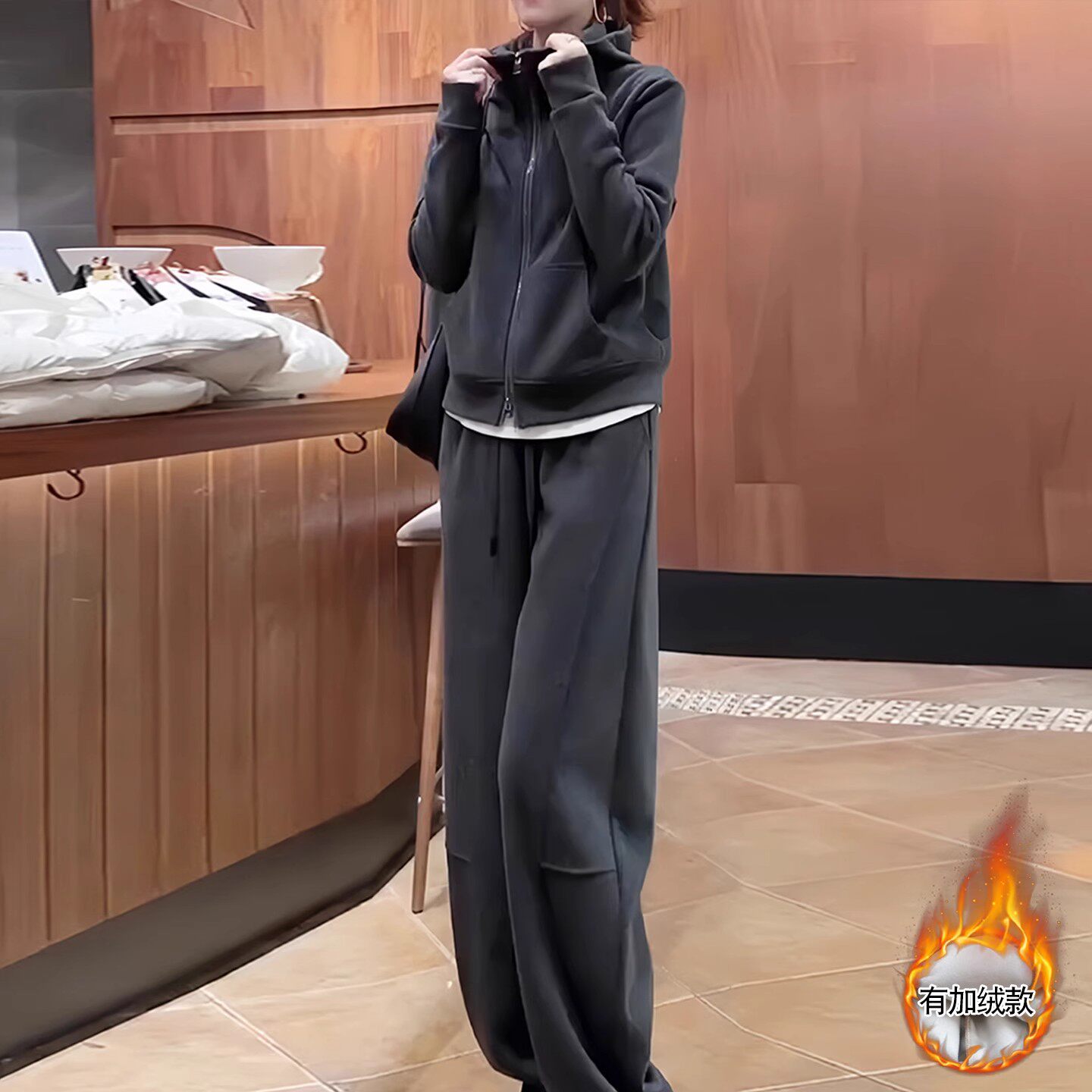 洋气时尚运动休闲套装秋冬韩版加绒加厚翻领卫衣拉链外套阔腿裤女